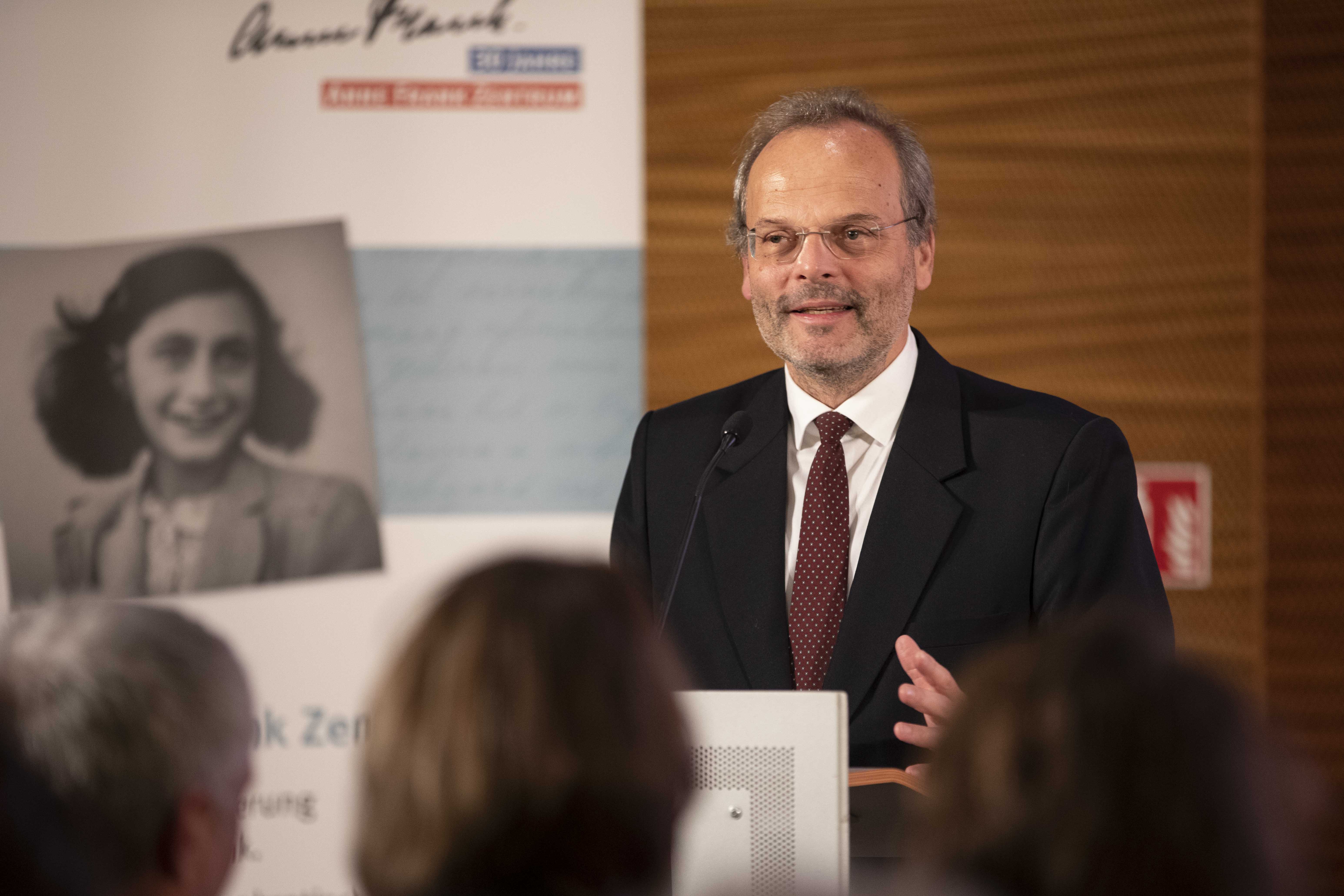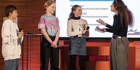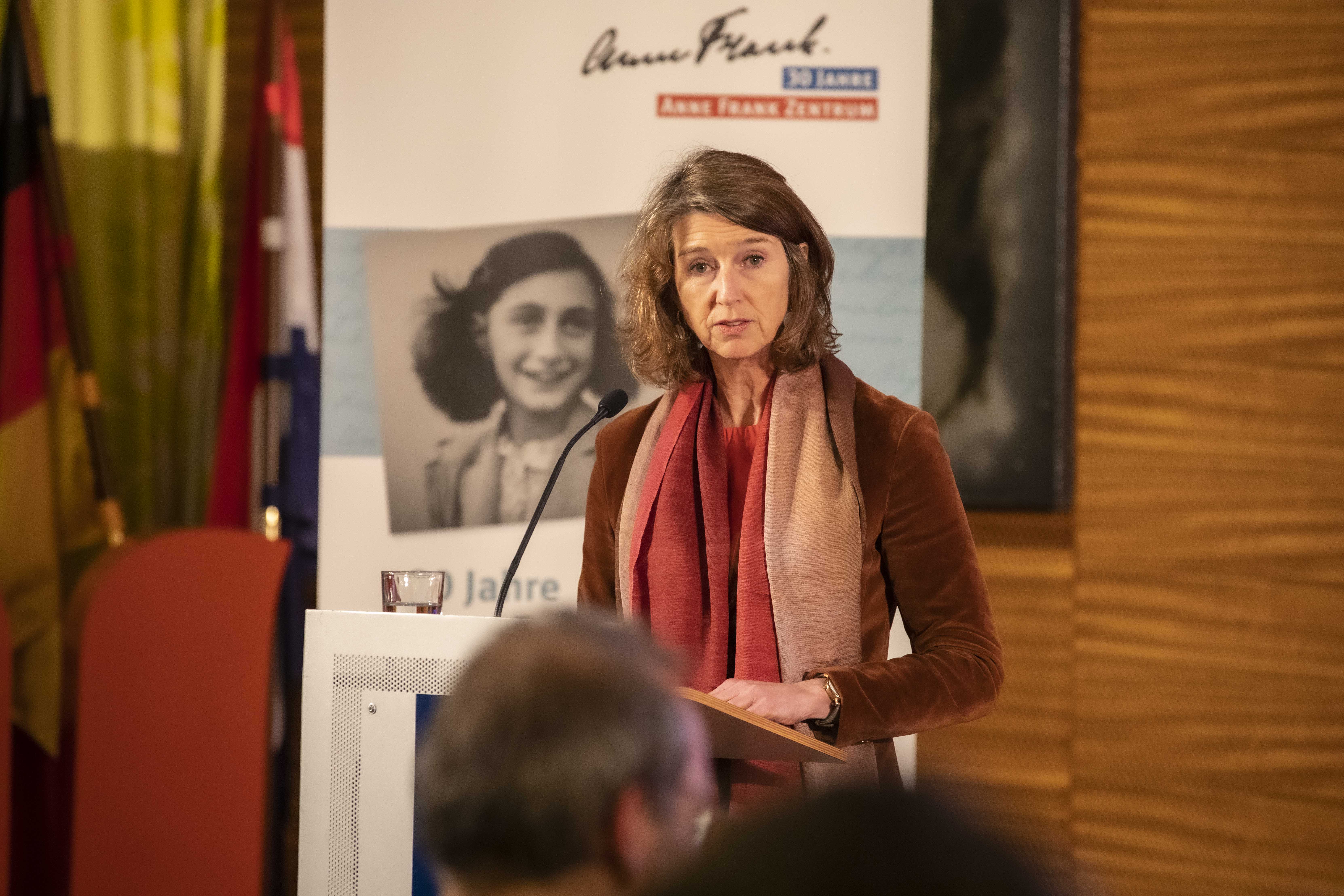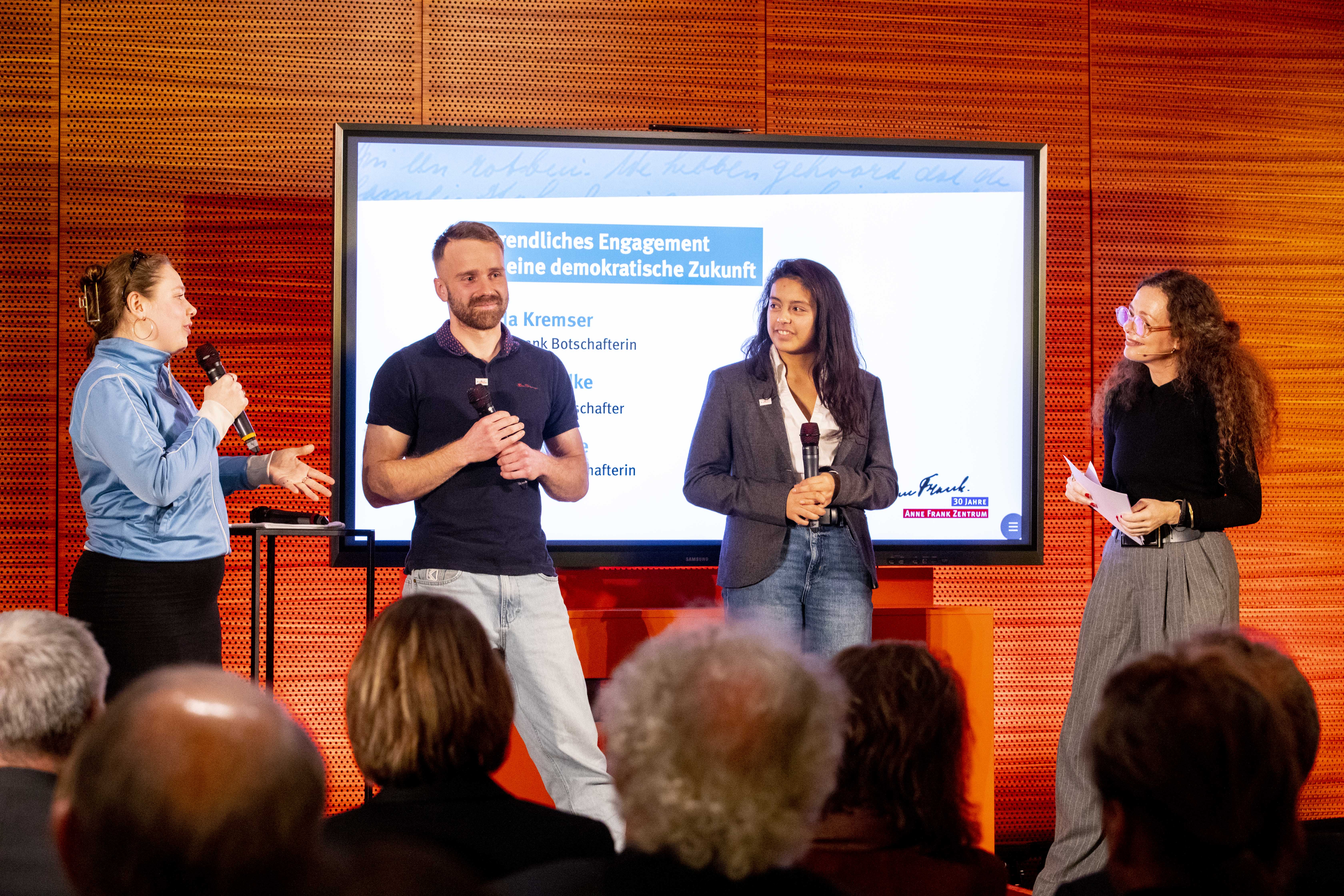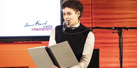 Hester Somsen, Botschafterin des Königreichs der Niederlande, sowie Dr. Felix Klein, Beauftragter der Bundesregierung für jüdisches Leben in Deutschland und den Kampf gegen Antisemitismus, hielten Grußworte. Zudem las die mit Anne Frank verwandte Schauspieler*in Leyb-Anouk Elias Auszüge aus deren Tagebuch. Ulrich Funk und Thomas Heppener, die Initiatoren des Anne Frank Zentrums, erinnerten an die Anfänge in den 1990er-Jahren. Ronald Leopold, Direktor des Anne Frank Hauses in Amsterdam, vermittelte eindrucksvoll, welche Relevanz das Anne Frank Zentrum als deutsche Partnerorganisation für ihn hat. Zudem erklärten Schüler*innen der Anne Frank Grundschule Berlin, warum ihnen die Erinnerung an Anne Frank wichtig ist und weshalb sich ihre Schule gegen Diskriminierung einsetzt. Über eigene Projekte für eine demokratische Zukunft sprachen die Anne Frank Botschafter*innen. Chasan Jalda Rebling, Tochter der Zeitzeugin Lin Jaldati, gestaltete gemeinsam mit Patrick Farrell die musikalische Rahmung. Die Direktorin des Anne Frank Zentrums Veronika Nahm dankte ihrem engagierten Team und berichtete über aktuelle Herausforderungen für den gemeinnützigen Verein und äußerte ihre Wünsche für die Zukunft.